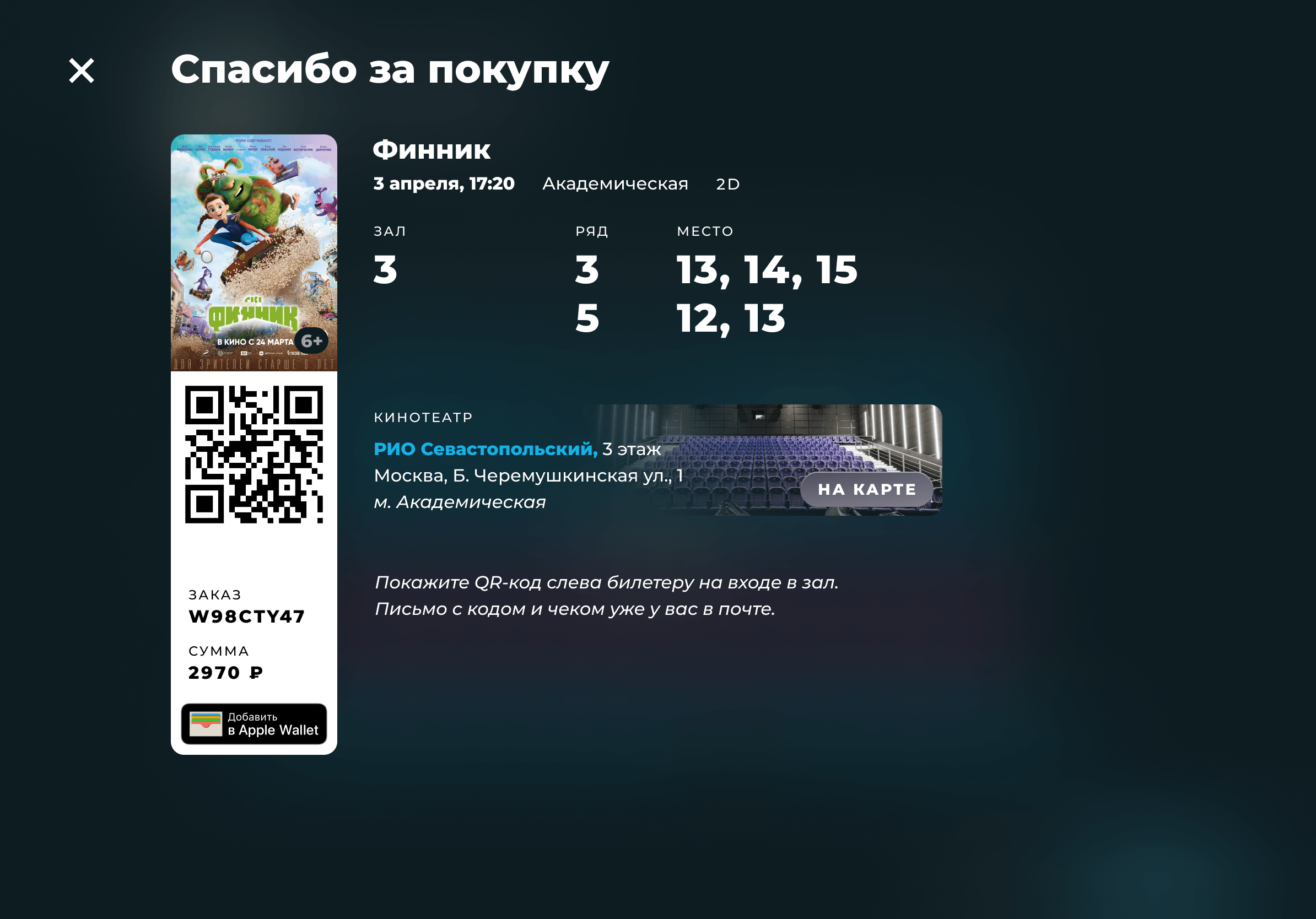 Купленный билет отправляется на почту или в Wallet.